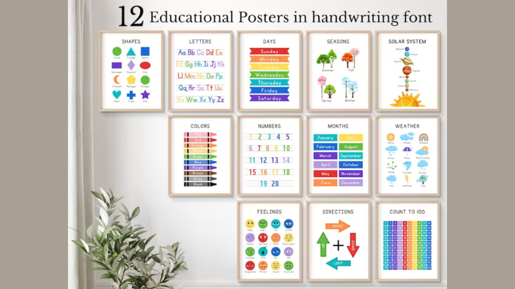 Set of 12 Educational Posters in handwriting font to help your little ones learn proper letter recognition and formation. Colorful bright colors are perfect for your bedroom, playroom, nursery or classroom!